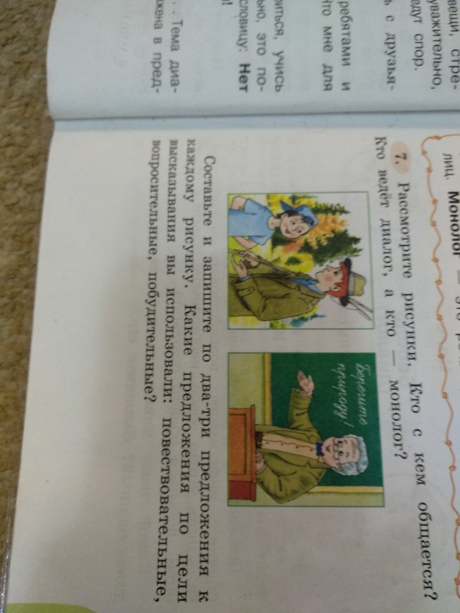 1 рисунок.-диалог.беседуют двое-сын и папа. Мальчик разговаривает с папой о рыбалке.Он спрашивает много ли рыбы поймал его отец.Папа рассказывает сыну о своём удачном улове.э 2.Монолог.Рассказывает один учитель. Преподаватель ведёт лекцию по экологии.Он призывает беречь природу.