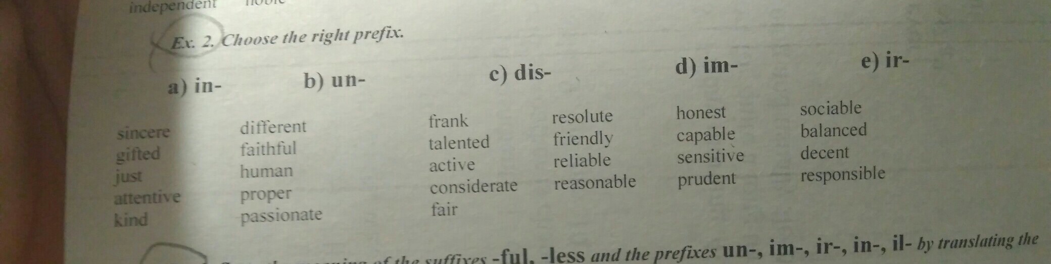 b) ungifted, unjust, unkind, unfaithful, untalented, unfair, unfrieandly, unreliable, unreasonable, unsociable.