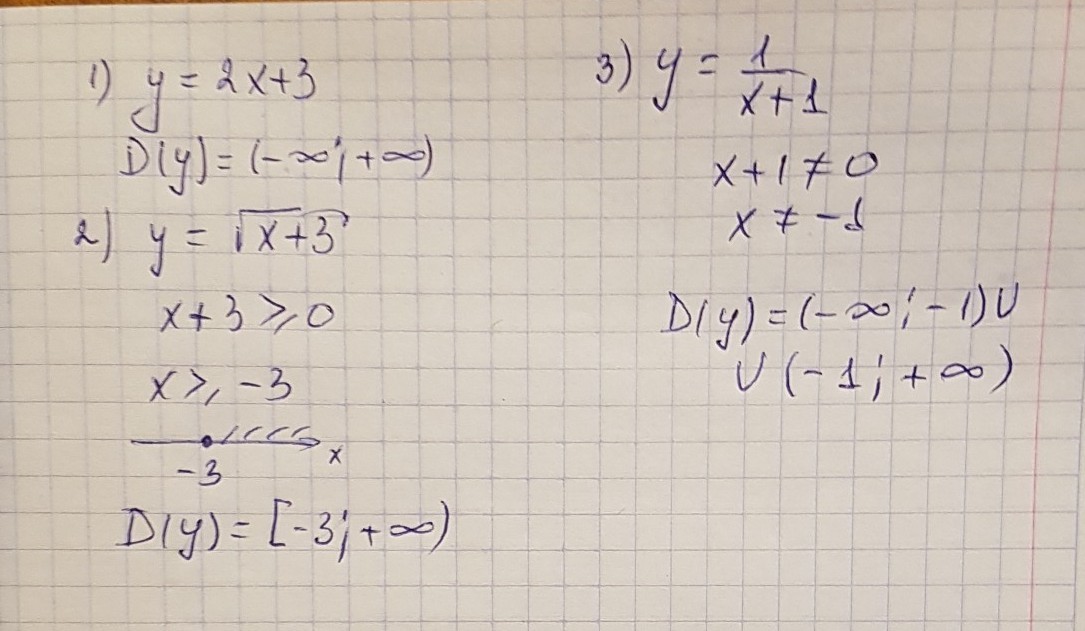 найдите область определения функции, заданной формулой 1) y=2x+3 2) y=корень x+3 3) y= 1x+1