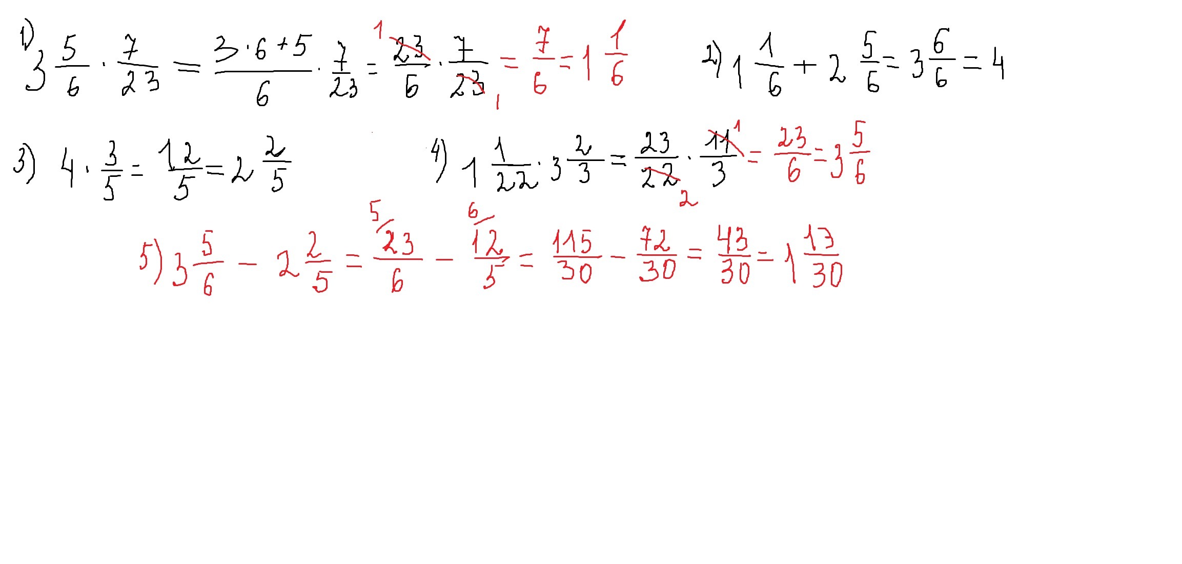 24/6-3/5=72/30 1 1/22 *3 2/3=23/22*11/2=23/2