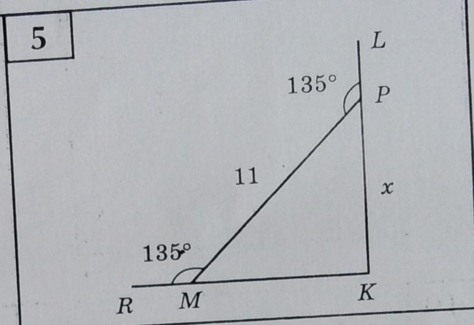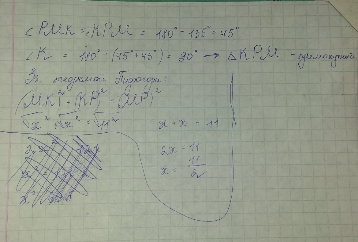 угол PKM=90 (2 угла равны по 45 градусов,вместе 90. Значит PKM=90)