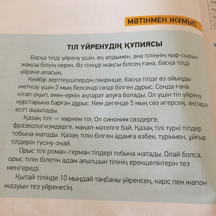Чтобы выучить другой язык, вы должны сначала знать язык своего родного языка. Только если вы знаете, что ваш язык хорошо учит другому языку. Некоторые исследователи предположили, что для того, чтобы быть эффективными на другом языке, лучше всего изучить 5000 слов. Только тогда вы сможете прочитать книгу и получить бесплатную информацию. Информационная дверь откроет не менее 10000 слов. Казахский язык - искусство. Он богат синонимами, фразеологией, пословицами. Казахский язык относится к тюркским языкам. При изучении казахского языка легко понять узбекский, туркменский и уйгурский языки. Русский язык относится к группе римско-немецких языков. Таким образом, свободный российский оратор быстро изучает английский.болады ма