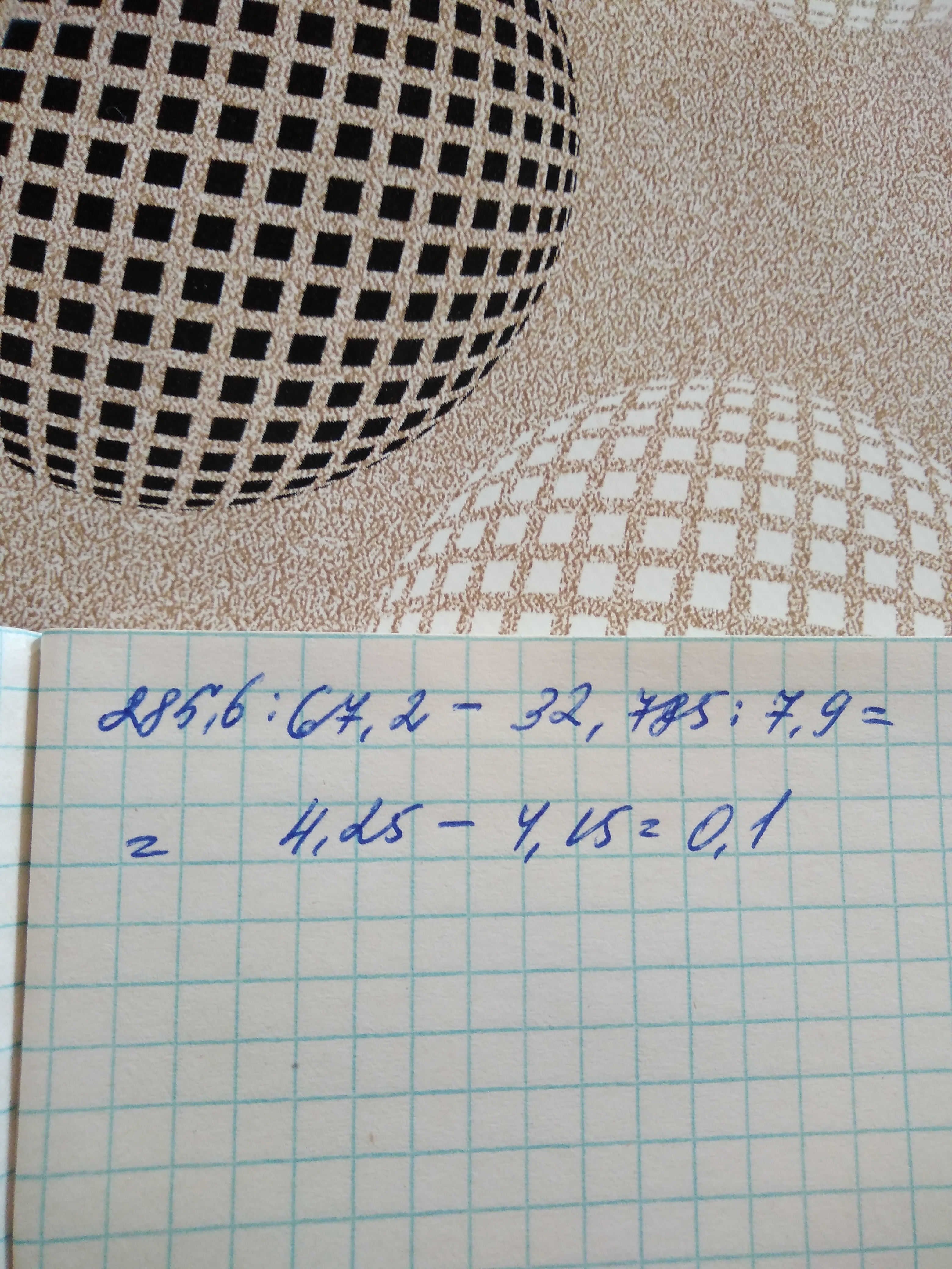 285,6÷67,2-32,785÷7,9=4,25-4,15=0,1