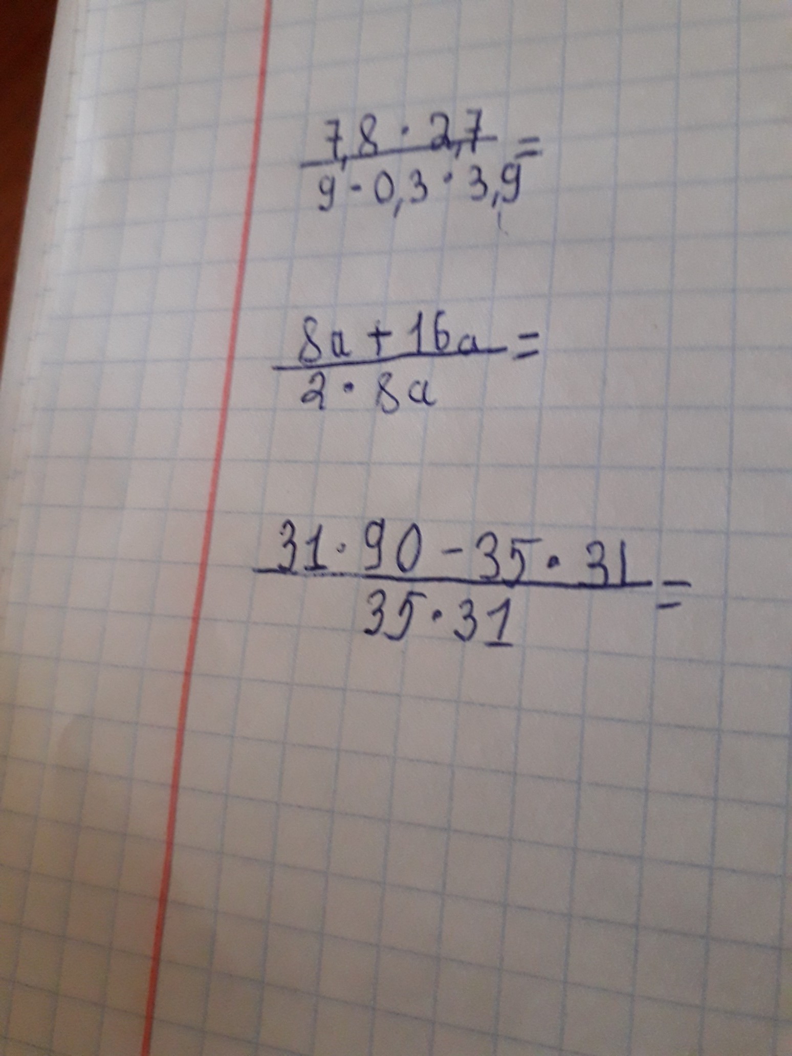 1) Ответ 2 . Там все очень просто 7,8 сокращаем с 3,9 , получается, что вместо 7,8 получается 2 , а вместо 3,9 получается 1 . Потом 9 сокращаешь с 2,7 , получается вместо 9 цифра 1 , а вместо 2,7 получается 0,3 . Потом просто сокращаем 0,3 с 0,3 и у нас получается выражение 2/1 в итоге ответ 2
