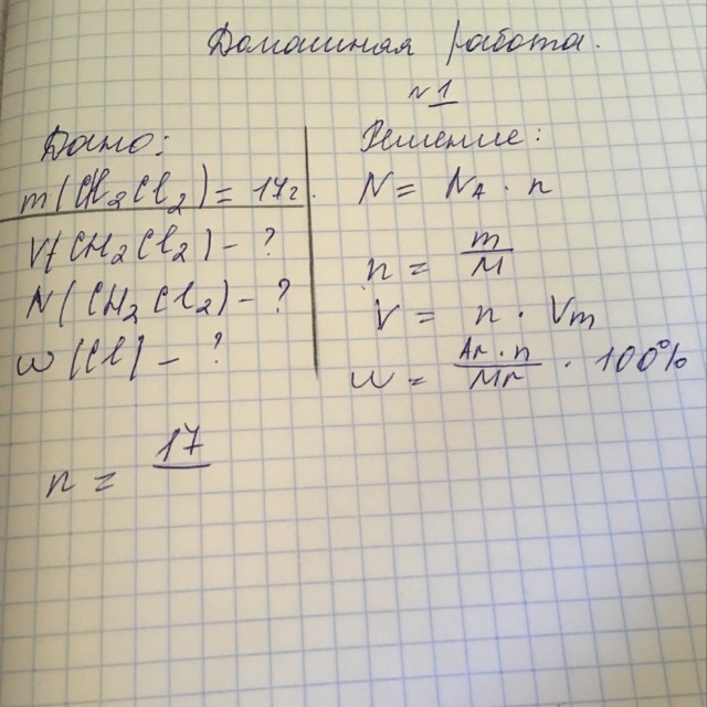 2. n (CH₂Cl₂) = 17 г : 85 г/моль = 0,2 (моль).