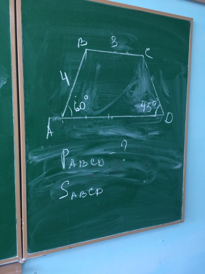 Нужно найти периметр и площадь трапеции ABCD,у которой стороны AB=4см,BC=3см.Угол BAD=60,угол CDA=45