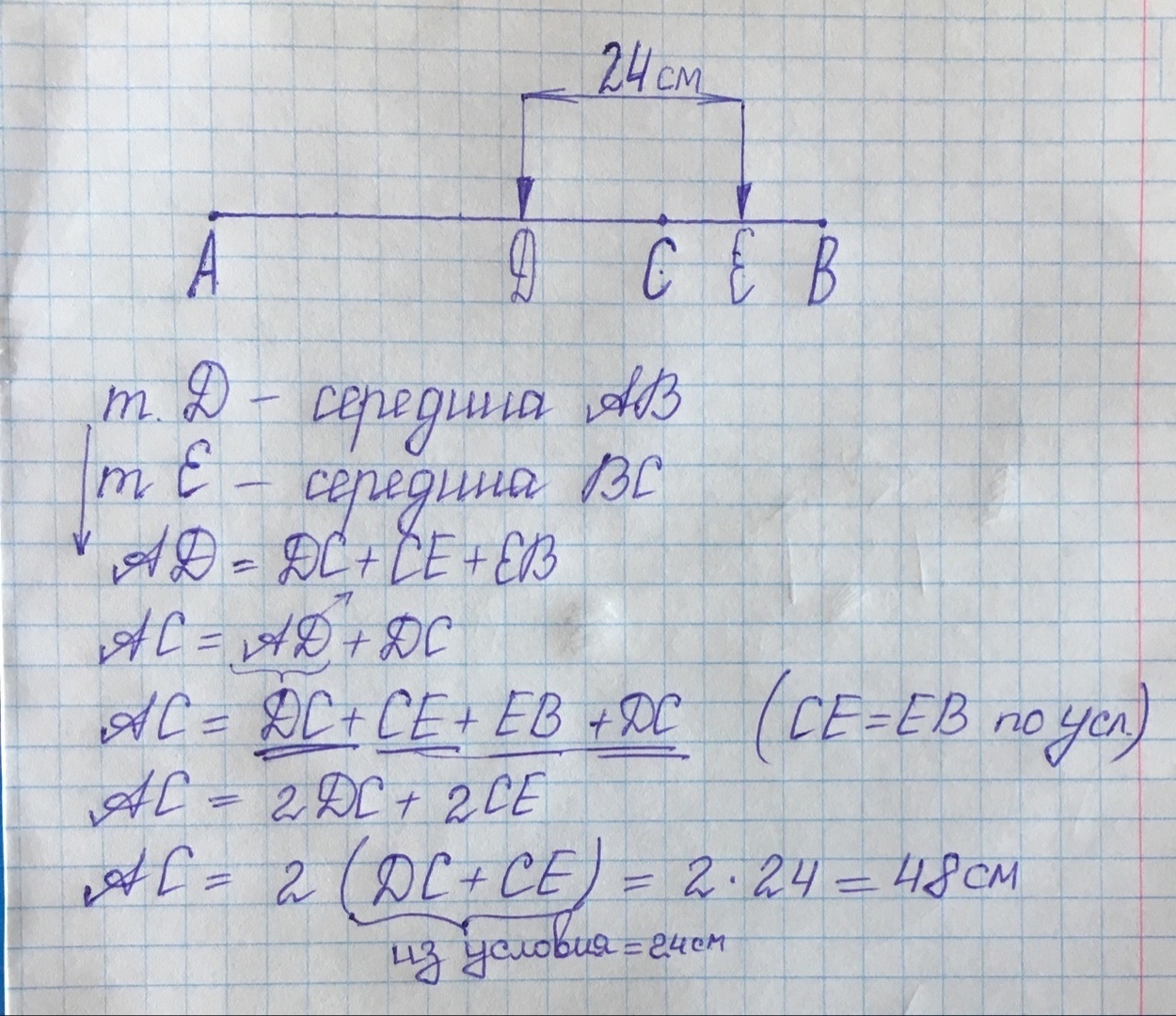 на отрезке АВ отмечена точка С, где АС>ВС, Расстояние между серединой отрезка АВ и серединой отрезка ВС равно 24см. Найдите длину отрезка АС