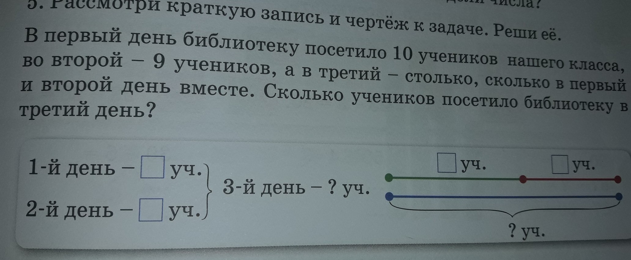 в первый день библиотеку посетили10 учеников нашего класса во второй 9 учеников , а втретий столько сколько в первый и второй день вместе. сколько учеников посетило библиотеку в третий день?
