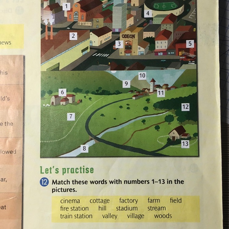 1 train station 2 factory 3 cinema 4 stadium 5 fire station 6 farm 7 field 8 stream 9 valley 10 hill 11 woods 12 village
