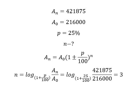 Известно, что ставка банковского процента равна 25%. Определит, через сколько лет начальный вклад 216 000 рублей возрастет до 421 875 рублей.