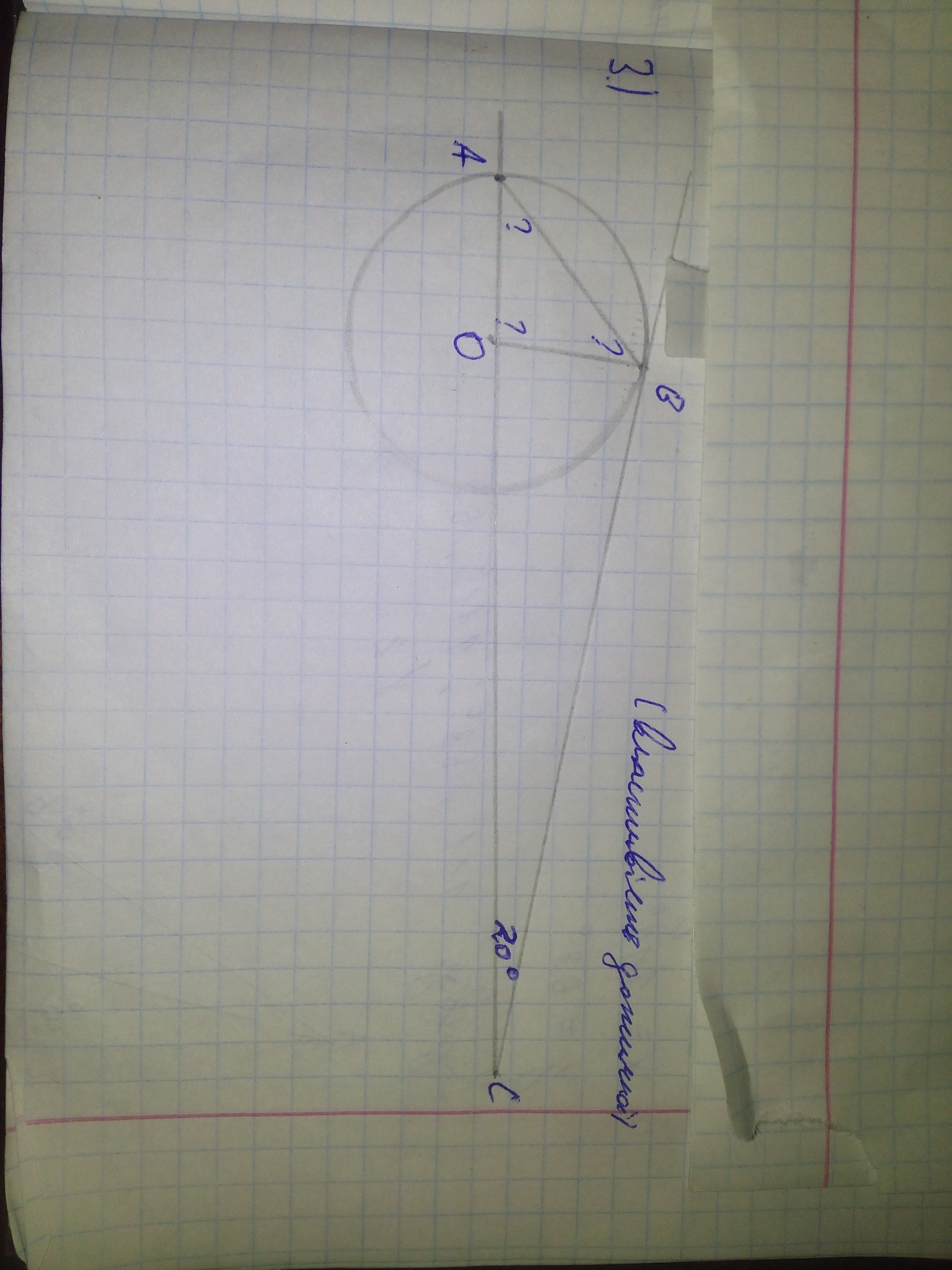Касательная к окружности перпендикулярна радиусу, проведенному в точку касания. Следовательно, угол СВО является прямым и равен 90град. Исходя из того, что сумма углов в треугольнике всегда равна 180град, можно вычислить угол СОВ. 180-20-90= 70град. Угол АОВ является смежным углом к углу СОВ, следовательно, их сумма также будет равна 180град. Следовательно, угол АОВ=110град. Для вычисления остальных углов следует доказать, что треугольник АОВ равнобедренный, что исходит из того, что стороны АО и ОВ являются радиусами и, следовательно, между собой равны. Следовательно, треуг. АОВ равнобедренный. Следовательно, углы ОАВ и ОВА равны, как углы, лежащие в основании равнобедренного треугольника. Следовательно, их можно вычислить, как (180 - угол АОВ):2 =70:2=35град