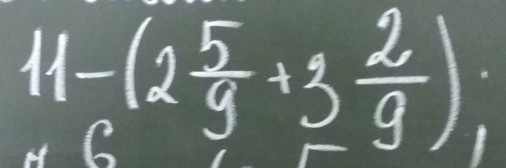 Сначала раскрываем скобки: 11 - (2 5/9+3 2/9)= 11 - 2 5/9 - 3 2/9 (знаки в скобках меняем на противоположные т.к. перед скобками стоит знак - .