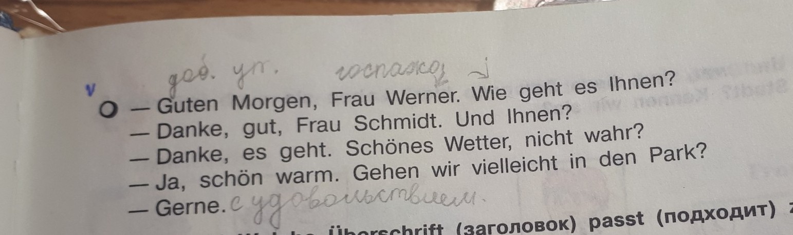 -доброе утро, госпожа Вернер.Как у Вас дела? -Спасибо,хорошо, госпожа Шмид. И у Вас? -Спасибо,нормально.Красивая погода, неправда? -Да,хорошо(красиво) тепло.Пойдем мы наверное(может быть) в парк? - с удовольствием