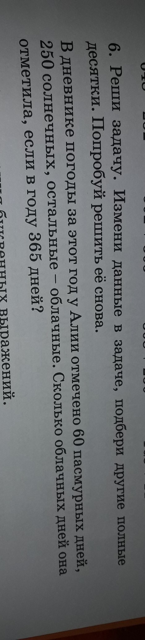 Реши задачу. измени данные в задаче, подбери другие полные десятки. попробую решить ее снова. в дневнике погоды за этот год У Алии отмечено 60 пасмурных дней ,250 солнечных ,остальные- Облачные сколько облачных дней она отметила ,если в году 365 дней? желательно с условием нужно.заранее спасибо