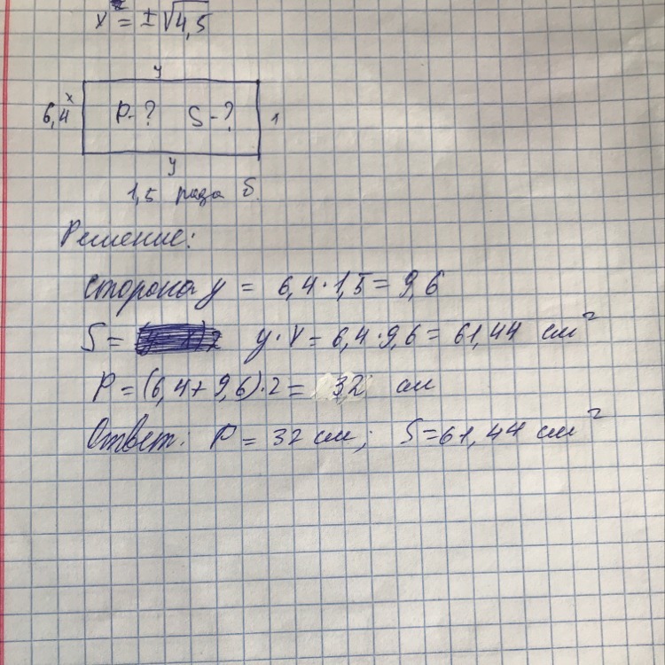 Находим вторую сторону 6,4*1,5=9,6см Находим периметр (6,4+9,6)*2=16*2=32см Можно так 6,4+9,6+6,4+9,6=32см Находим площадь 6,4*9,6=61,44см.кв.