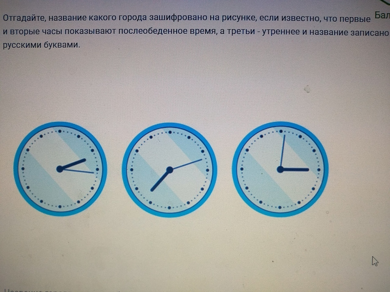 Отгадайте, название какого города зашифровано на рисунке, если известно, что первые и вторые часы показывают послеобеденное время, а третьи - утреннее и название записано русскими буквами.