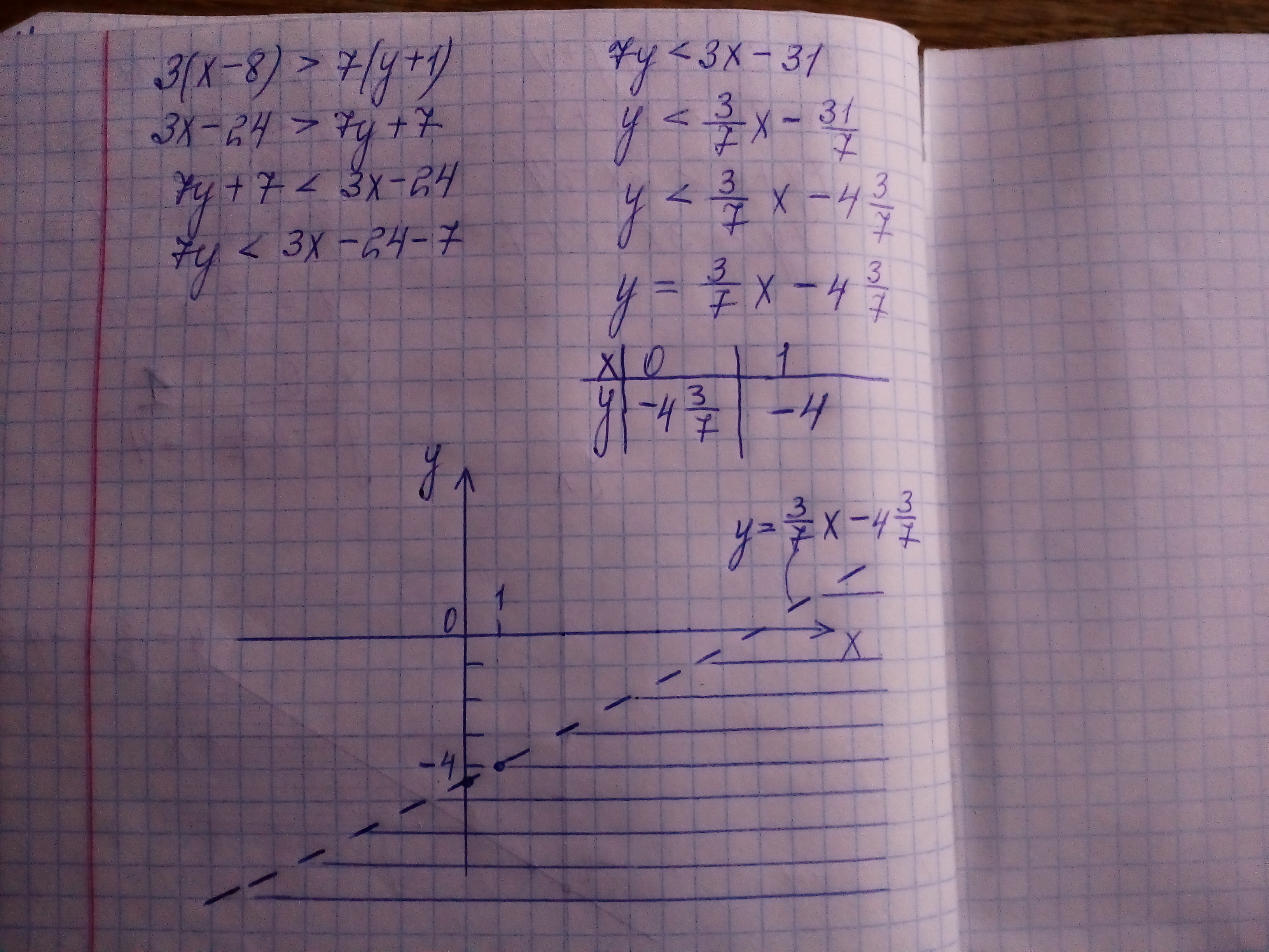 Изобразить на плоскости множество точек М(х,у), удовлетворяющих условию 3(х-8) > 7(у+1)