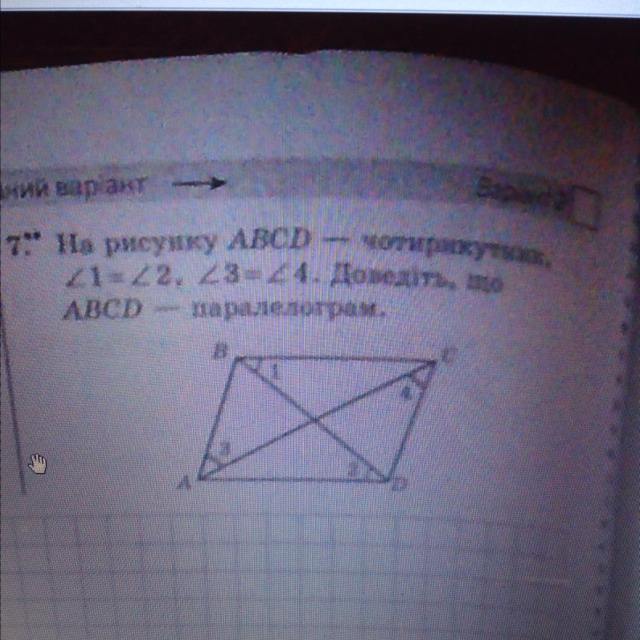 Кут1=кут2 - якщо при перетині двох прями третьою внутрішні різносторонні кути рівні то прямі параллельні ВС параллельна АД, теж саме для кутів 3=4
