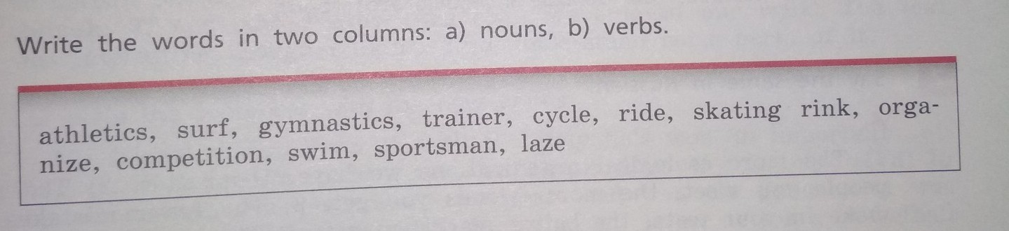 nouns: athletics, surf, gymnastics, trainer, cycle, ride, skating rink, competition, sportsman,