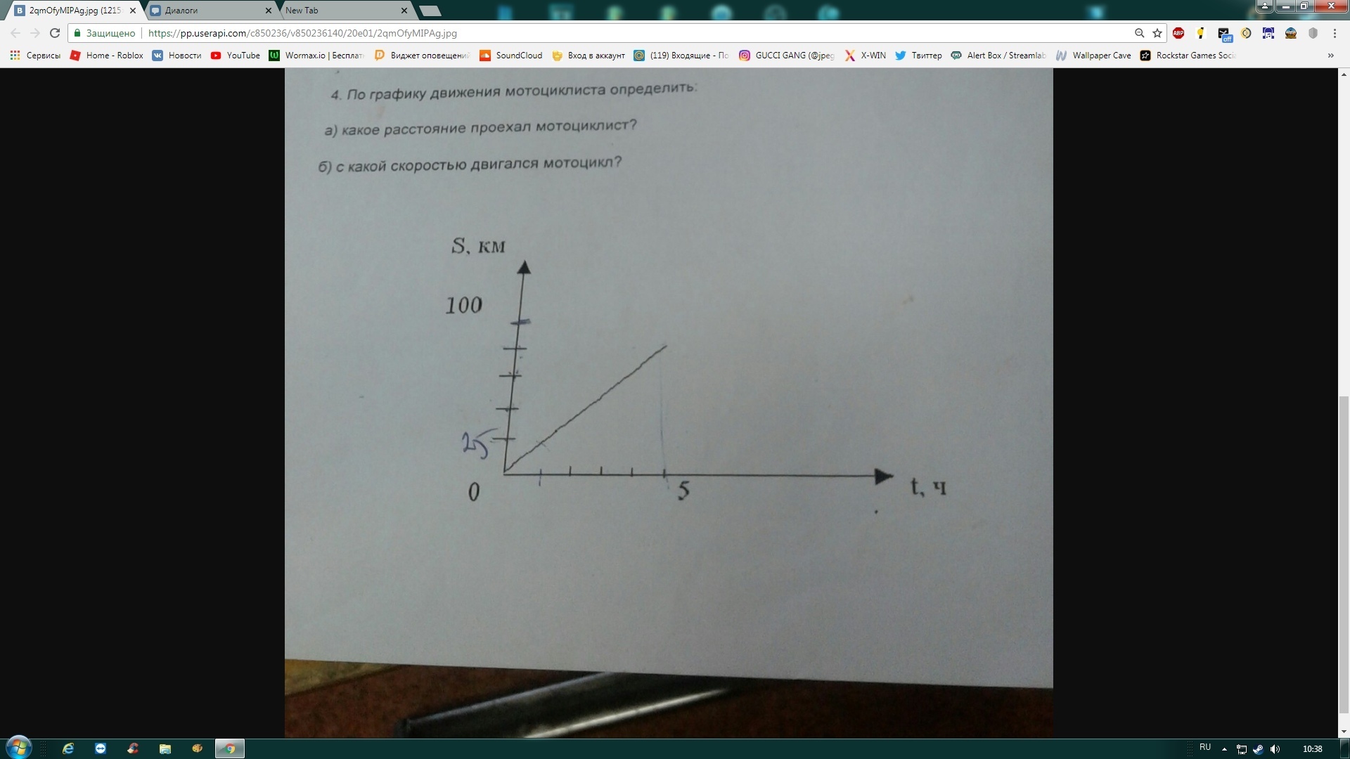 из графика видно, что он проехал расстояние 100 км за 5 часов, значит скорость движения была 100:5 = 20 км/ ч