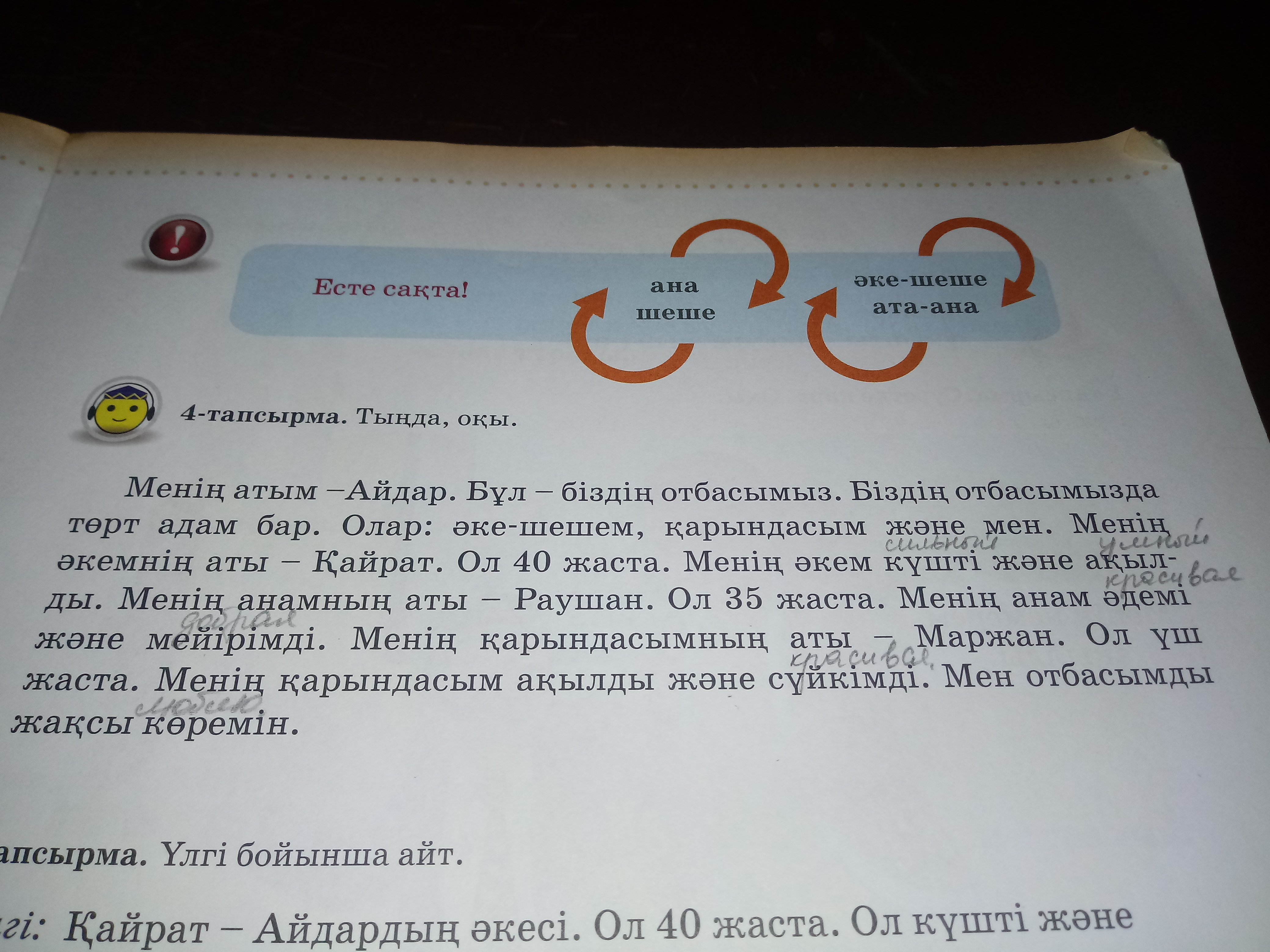 - меня зовут-Айдар.это моя семья.в моей семье четыре человека.это:папа,мама,сестренка и я.моего папу зовут Кайрат.ему 40 лет.мой папа очень сильный и умный.мою маму зовут Раушан.ей 35 лет.моя мама красивая и добрая.мою сестрёнку зовут Маржан.ей 3 года.моя сестрёнка умная и милая.Я люблю свою семью.