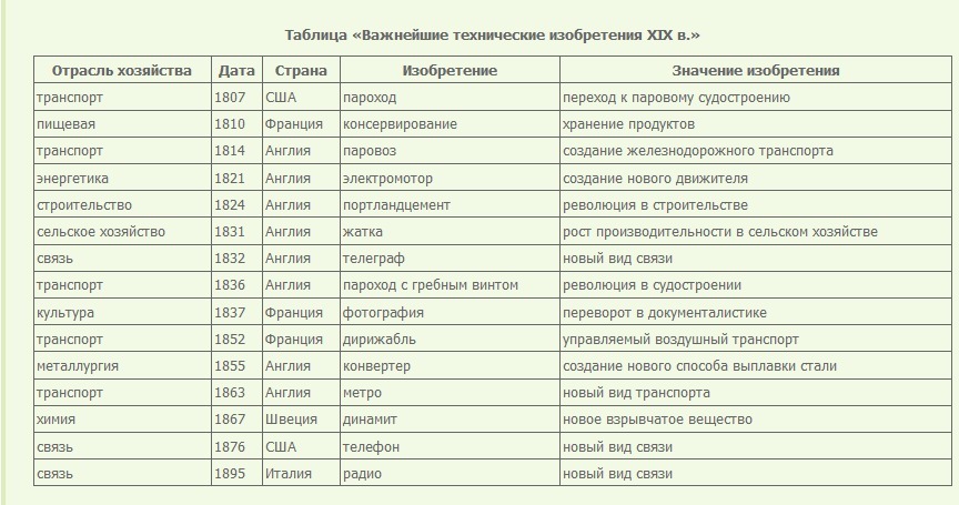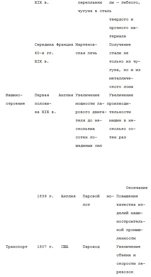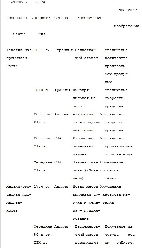 Помогите, пожалуйста. Нет учебника всеобщей истории 8 класса. А задали домашнее задание по нему. И так, надо сделать таблицу (отрасль, изобретение, страна и год, изобретатель, значение), можете просто написать кратко, кто что сделал и когда и какое значение имеет это дело. И кстати с 1765 года до 1900. Вроде так. Спасибо огромное)))