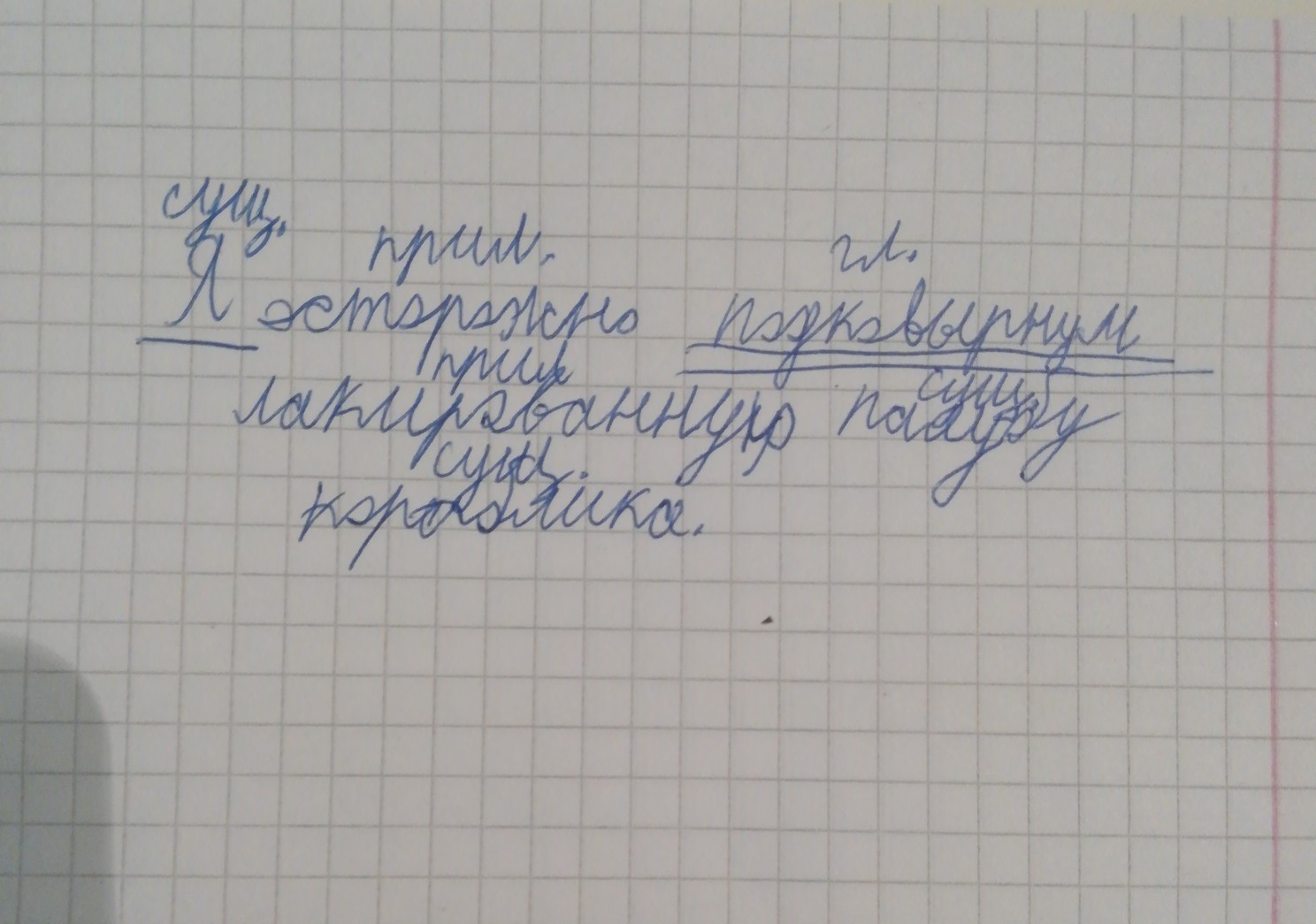 Я осторожно подковырнул лакированную палубу караблика.подчеркнуть главные члены.Над каждым словом написать какой частью речи оно является