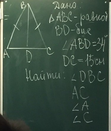 Угол DBC= 34° т.к равен углу ABD. АС= 30.BD поделило AC пополам. Получается 15+15=30 Угол А=56, (180-34-90). Угол С тоже =56.