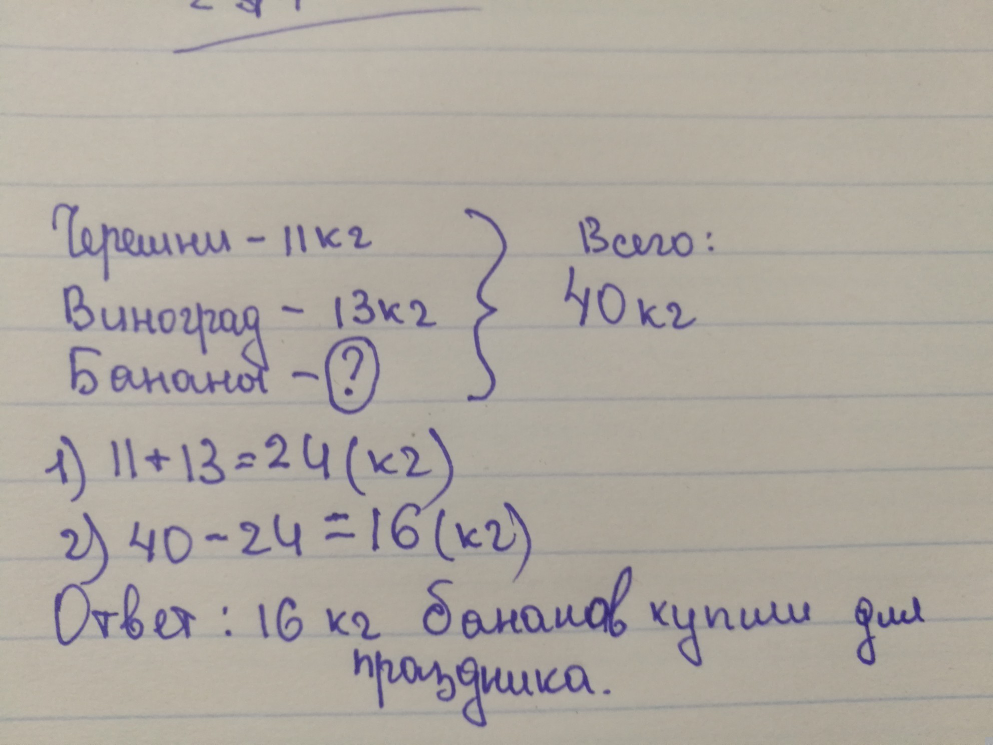 Для проведения праздника купили 40кг фруктов.Из них 11кг черешни,13кг винограда и бананы.Сколько кг бананов купили для праздника