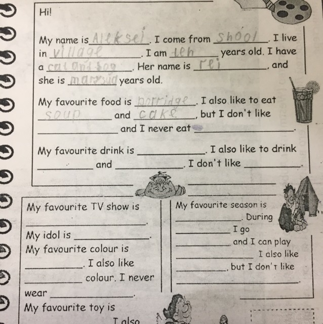 My name is Aleksey. I come from school. I live in thevillage. I am ten years old. I have a cat. Her name is Murka and she is 2 years old. My favourite food is porridge(каша). I also like to it soup and cake,but i don't like eggs(яйца), and never eat omlette(омлет). My favourite drink is juice(сок).Ialso like to drink water and tea.I don't like milk. My favourite tv show is Field of Dreams(поле чудес) My idol is Chak Norrise. My favourite colour is blue(голубой). I also like red colour. I never wear a coat(пальто). My favourite toy is car. My favourite season is summer.During summer i can play football. I also like to swim in the river.But i don't like to play badminton.