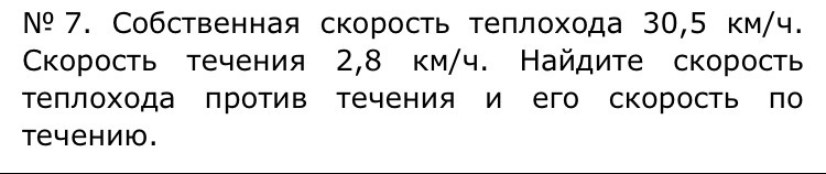 30,5 - 2,8 = 27,7 (км/ч) скорость теплохода против течения.