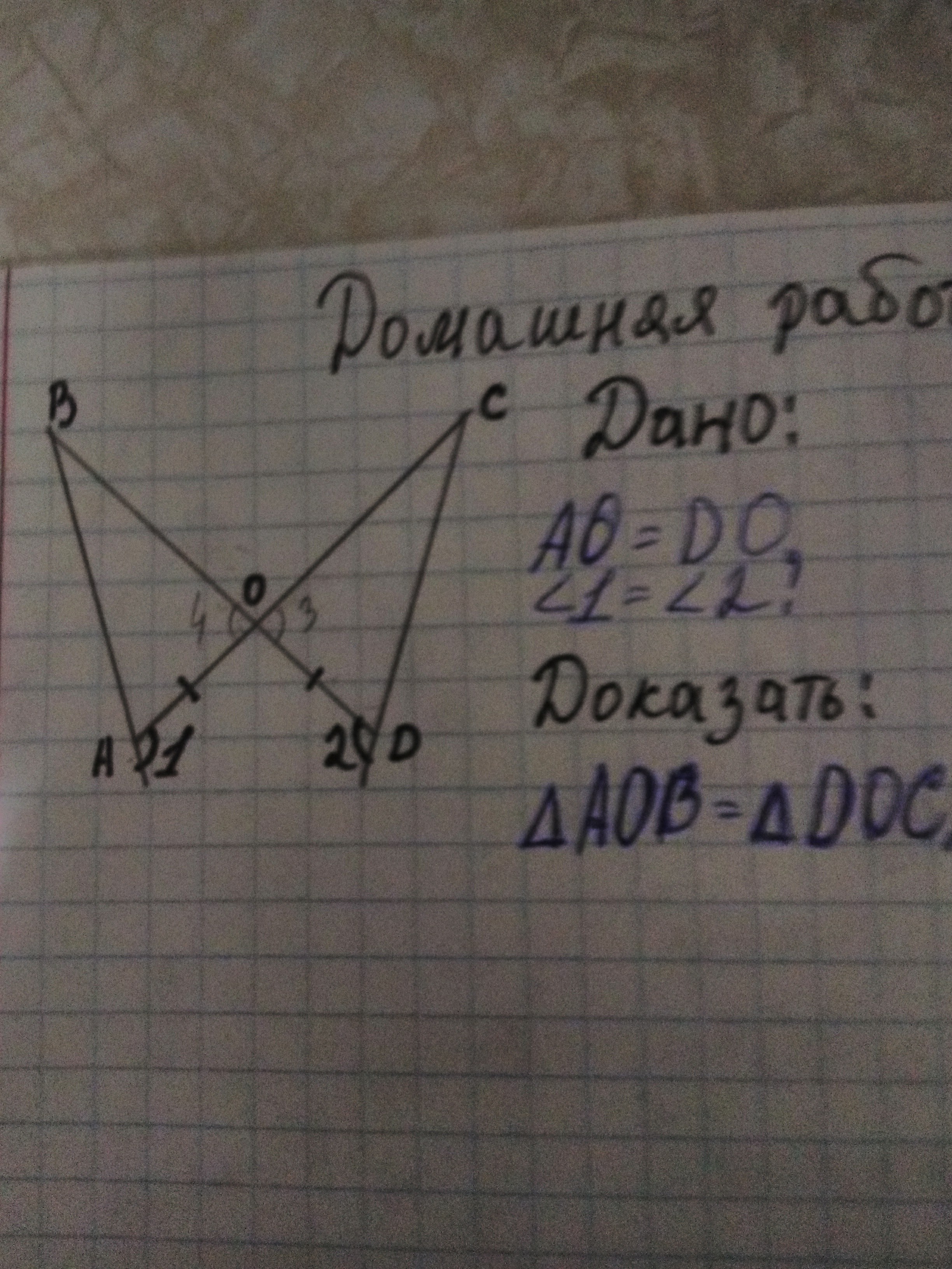 Треугольники АОВ и ДОС будут равны по второму признаку равенства треугольников, то есть по стороне и двум прилежащим к ней углам: 1. АО=ДО; 2. Угол 4 = углу 3, т.к. они вертикальные; 3. Угол ВАО = углу СДО, как смежные к равным углам 1 и 2. Следовательно, треугольники АОВ и ДОС равны.