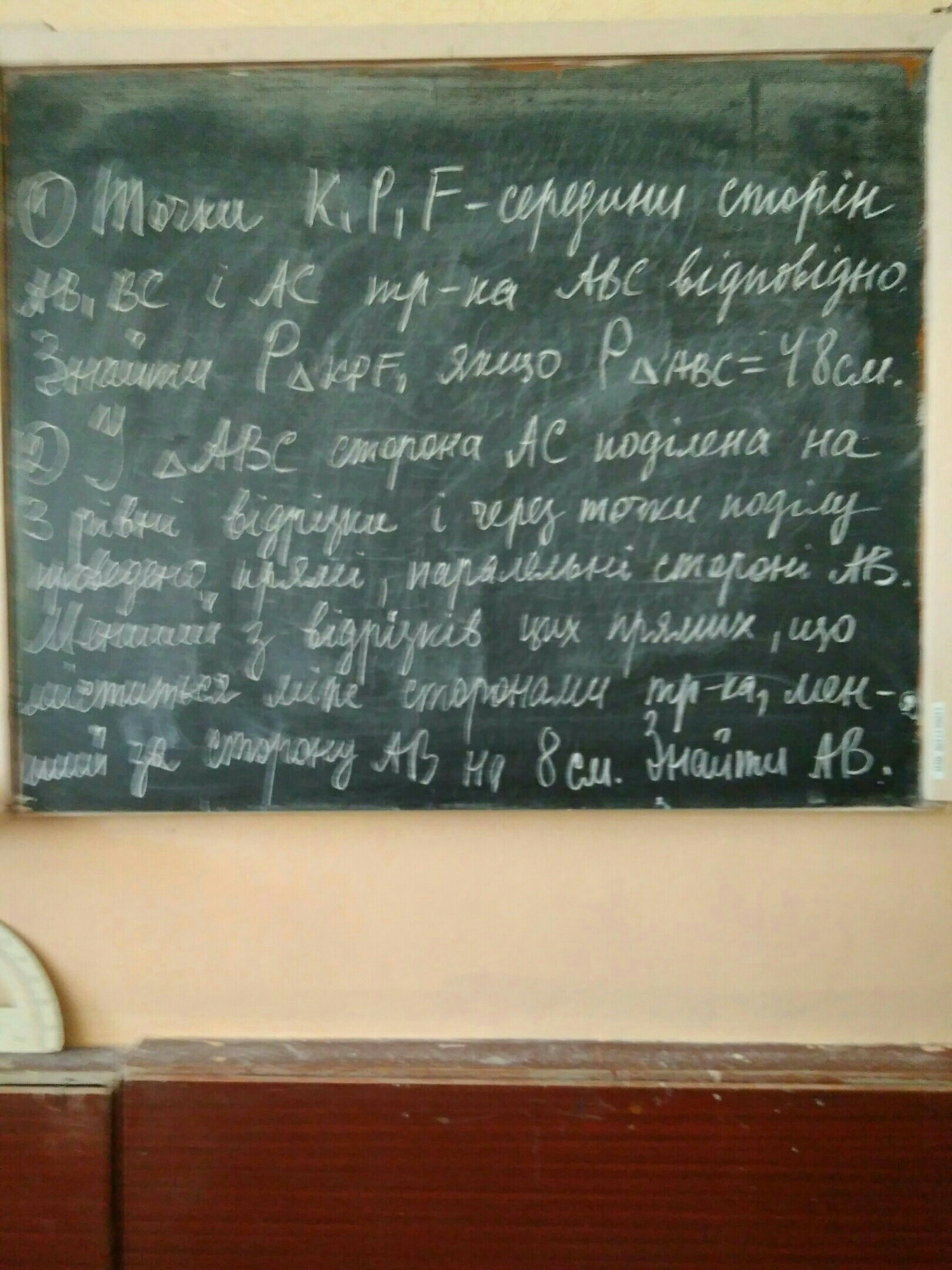 P(ΔKPF)=KF+KP+PF=(1/2)BC+(1/2)AC+(1/2)AB=(1/2)*(BC+AC+AB)=(1/2)P(ΔABC)=(1/2)·48=24 cм