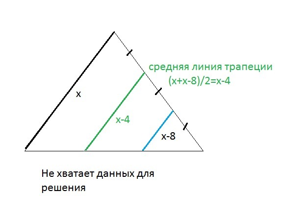 / - дробная черта. Маленький треугольник подобен большому с коэффициентом подобия 1:3, значит (х-8):х=1:3; х=3х-24; 2х=24; х=12