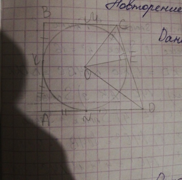 В прямоугольную трапецию ABCD вписана окружность , радиус OE проведенный к стороне CD делит её на CE=9 ED=16 , найдите площадь трапеции.