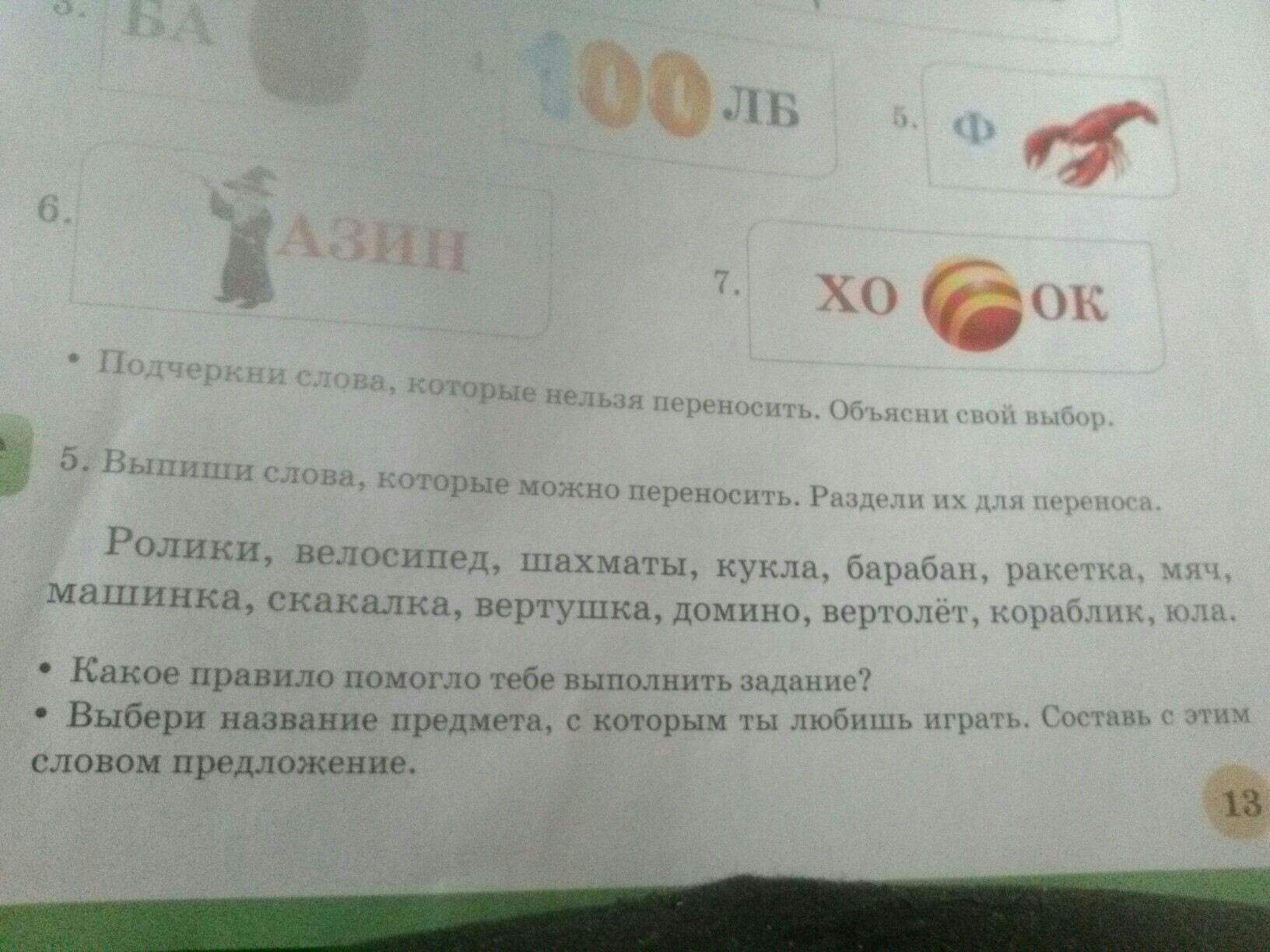 Ро-лики, вело-сипед, шах-маты Ку-кла, бара-бан, ра-кетка, мяч не можем, машин-ка, скака-лка, верту-шка, доми-но, вер-толет, ко-раблик, юла не можем