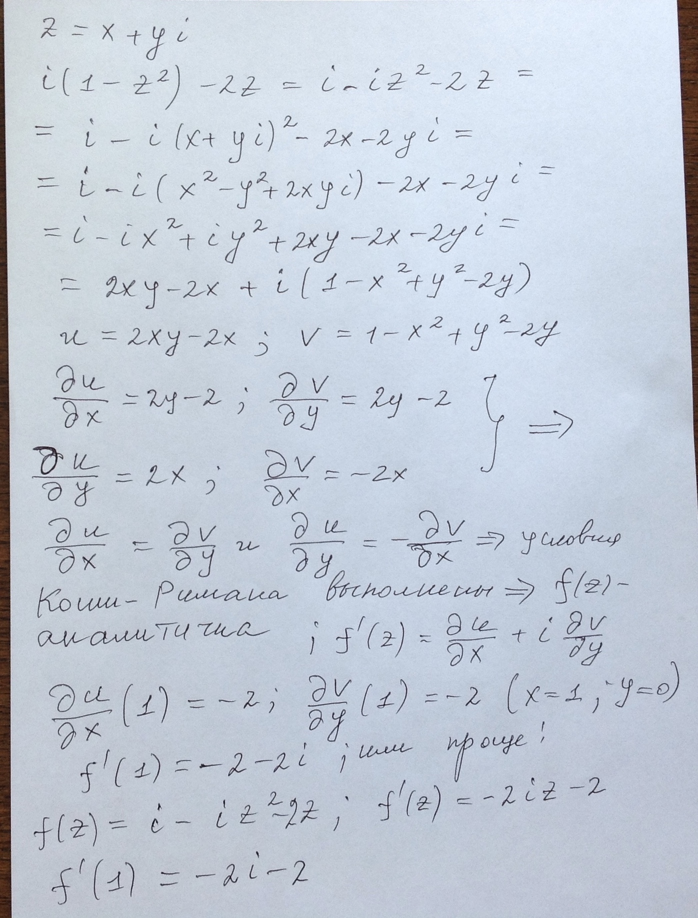 Представить заданную функцию w=f(z), где z=x+iy, в виде w=u(x,y)+iv(x,y), проверить, является ли она аналитической. Если да, то найти значение её производной в заданной точке z0.