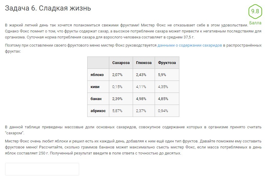Поэтому при составлении своего фруктового меню мистер Фокс руководствуется данными о содержании сахаридов в распространённых фруктах: