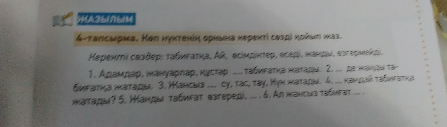 1. Адамдар, жануарлар, құстар жанды табиғатқа жатады. 2. Өсімдіктер де жанды табиғатқа жатады. 3. Жансыз табиғатқа су, тас, тау, Күн жатады. 4. Ай қандай табиғатқа жатады? 5. Жанды табиғат өзгереді, өседі. 6. Ал жансыз табиғат өзгермейді.