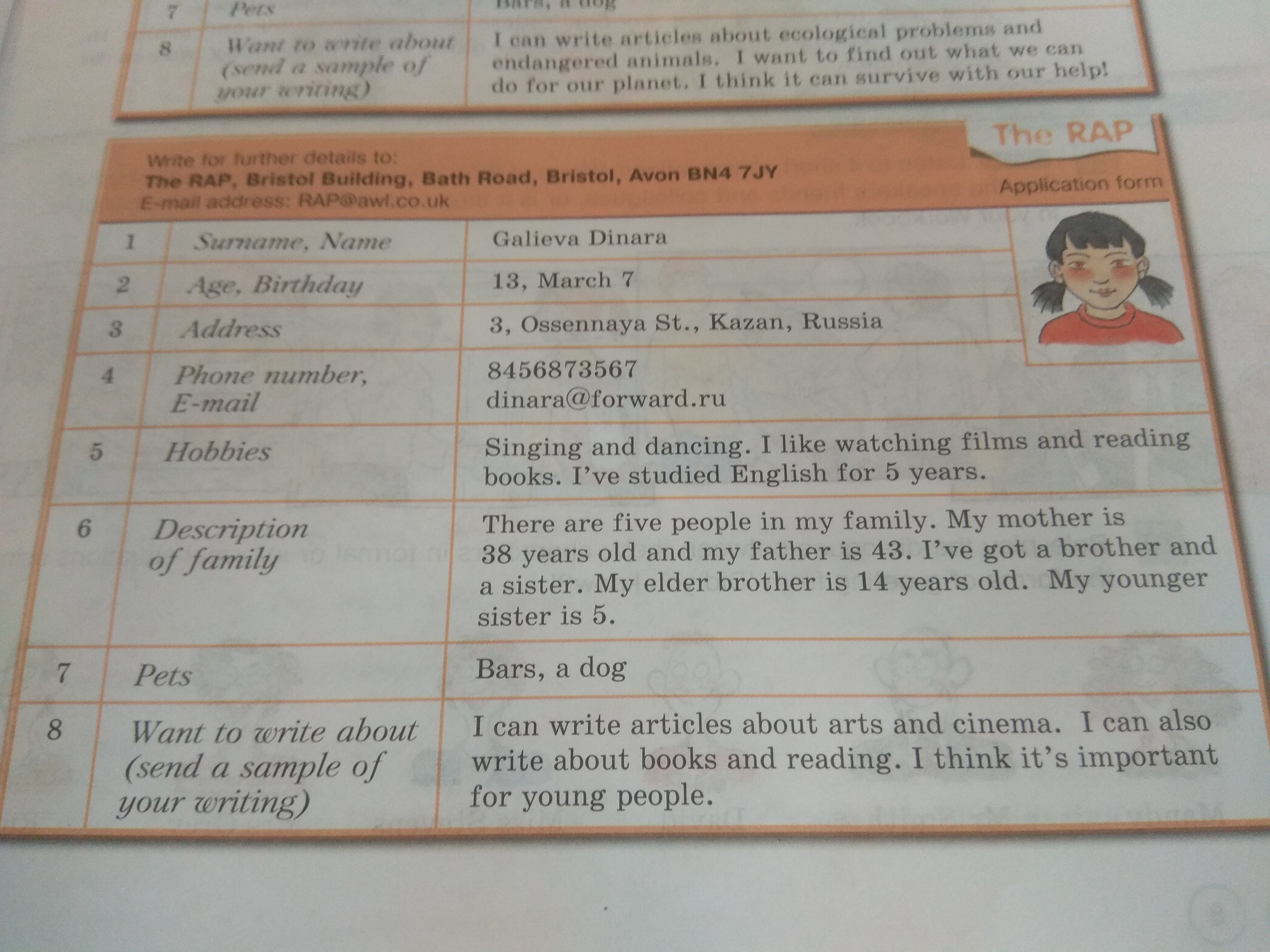 Dinara is 13. Her surname is Galieva. She lives in Kazan. She likes singing and dancing, watching films and reading books. She has studied English for 5 years. There are five people in her family. Her mother is 38 years old and her father is 43. She has got a brother and a sister. Her brother is 14 years old and her sister is 5. She has bars and a dog. She wants to write about arts and cinema, because it’s important for young people.