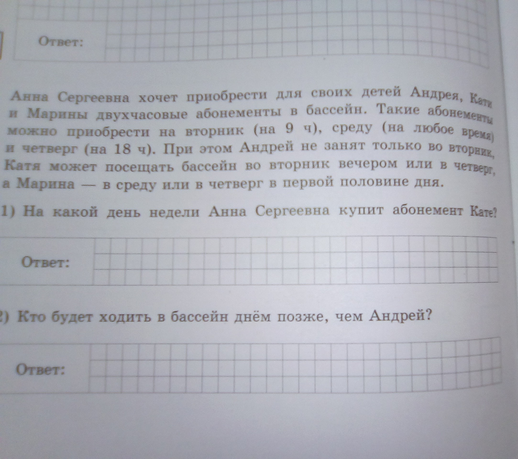 Кате купят абонемент на четверг в 18:00, так как в другое удобное для неё время абонементов нет, во вторник можно только утром, а Катя может только вечером.