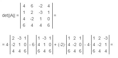 4*[2·1·6 + (-3)·0·4 + 1·(-2)·4 - 1·1·4 - 2·0·4 - (-3)·(-2)·6]+6*[1·1·6 + (-3)·0·6 + 1·4·4 - 1·1·6 - 1·0·4 - (-3)·4·6] -2*[1·(-2)·6 + 2·0·6 + 1·4·4 - 1·(-2)·6 - 1·0·4 - 2·4·6]-4*[1·(-2)·4 + 2·1·6 + (-3)·4·4 - (-3)·(-2)·6 - 1·1·4 - 2·4·4]=-144