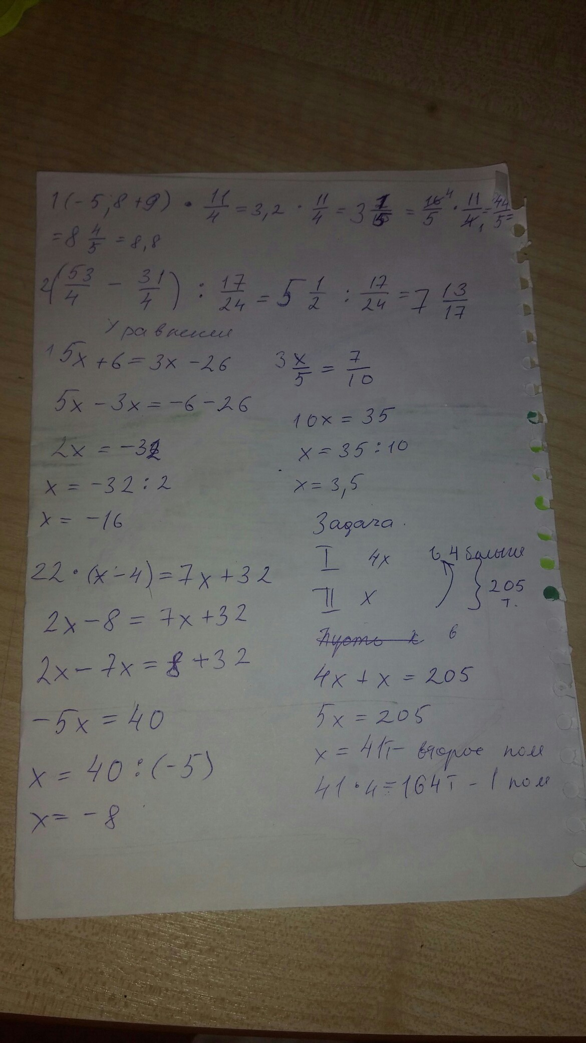 помогите (-5,8+9)*11/4=.. (53/4-31/4):17/24=..
