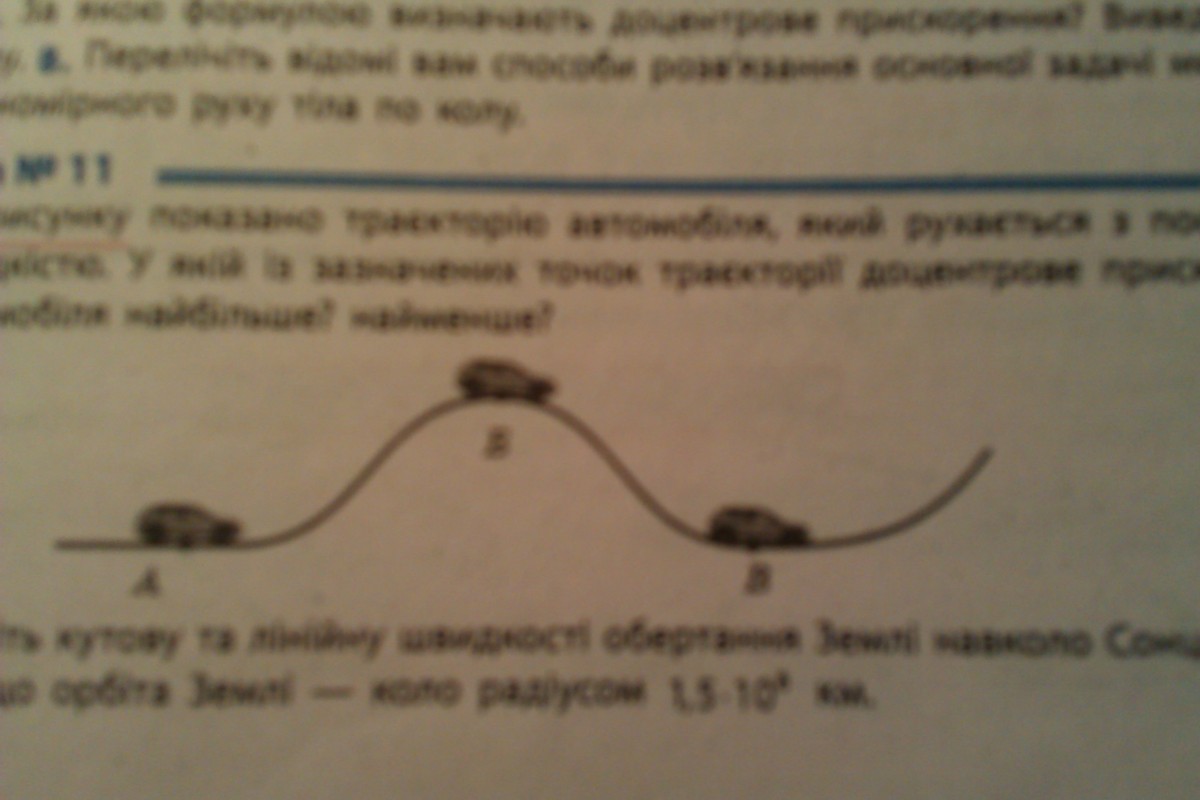 Помогите! не сложно! нужно решить задачку: на рисунке показана траектория автомобиля, движущегося с постоянной скоростью. В какой из указанных точек траектории центростремительное ускорение автомобиля наибольшее? наименьшее? рисунок во вложении