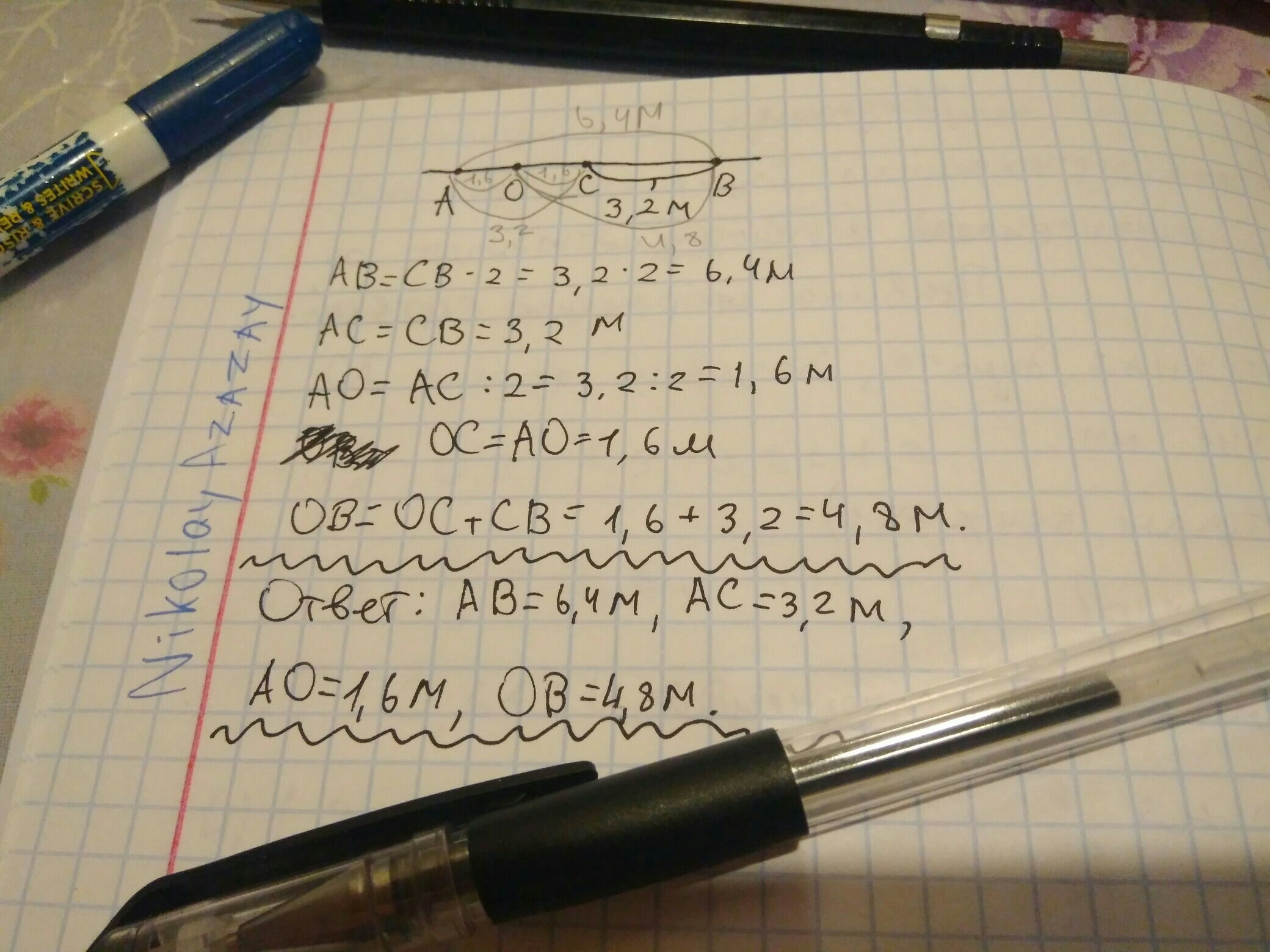 привет,я учусь в 7 классе мне нужна помощь с геометрией .Вот задача:( точка С - середина отрезка АВ, точка О- середина отрезка АС.Найдите АВ,АС,АО и ОВ,если СВ =3,2 м.)