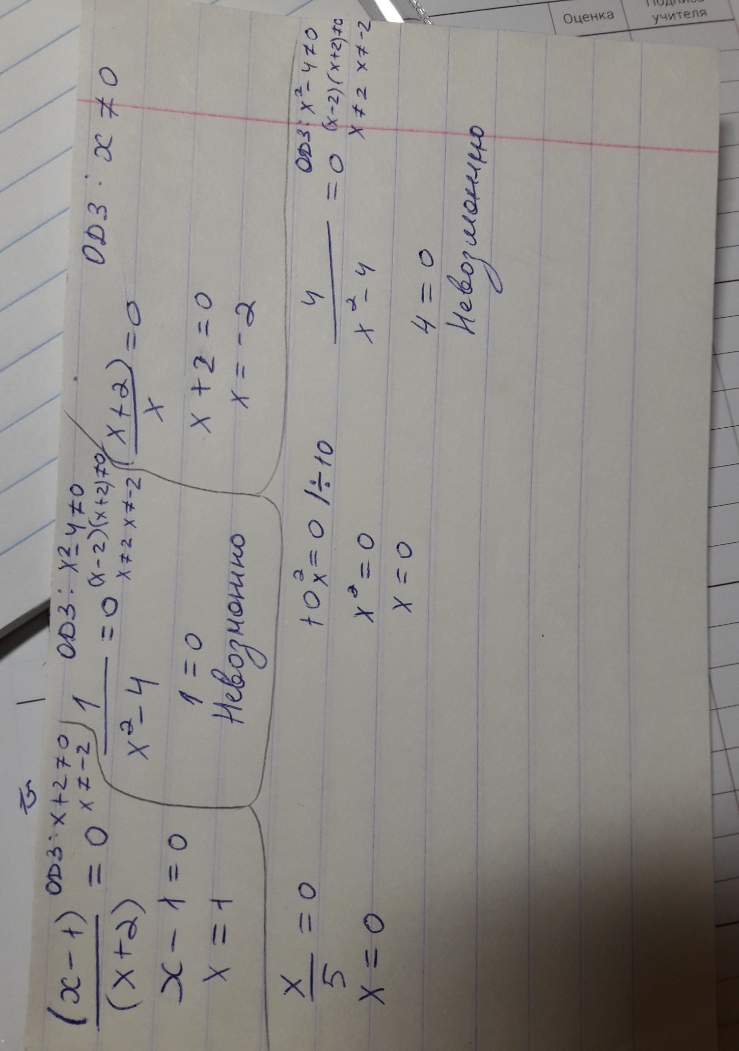 Вот смотри. Возьмём, например, 1-е уравнение. В нём x-1 - числитель, а x+2 - знаменатель. Знаменатель НЕ ДОЛЖЕН быть равен нулю. ОДЗ-это область допустимых значений. Когда решаешь уравнение, ты первым делом должен(а) найти ОДЗ, в этом поможет знаменатель. Берем знаменатель x+2 и находим x (x+2 не равен нулю, x не равен -2), получилось x не равен -2. Потом работаем с числителем, а на знаменатель не смотрим, и больше нигде его не пишем. Значит, x-1=0, x=1, ответ: x=1. Зачем ОДЗ спросишь ты, так вот, если бы в ОДЗ у нас получилось не -2, а 1, например, то уравнение бы не решалось. Получается, если в уравнение x=1, то в ОДЗ x не должен ровняться единице. В общем, всё. Но я очень плохо объясняю, извини) Если что-то непонятно, спрашивай, попытаюсь объяснить))