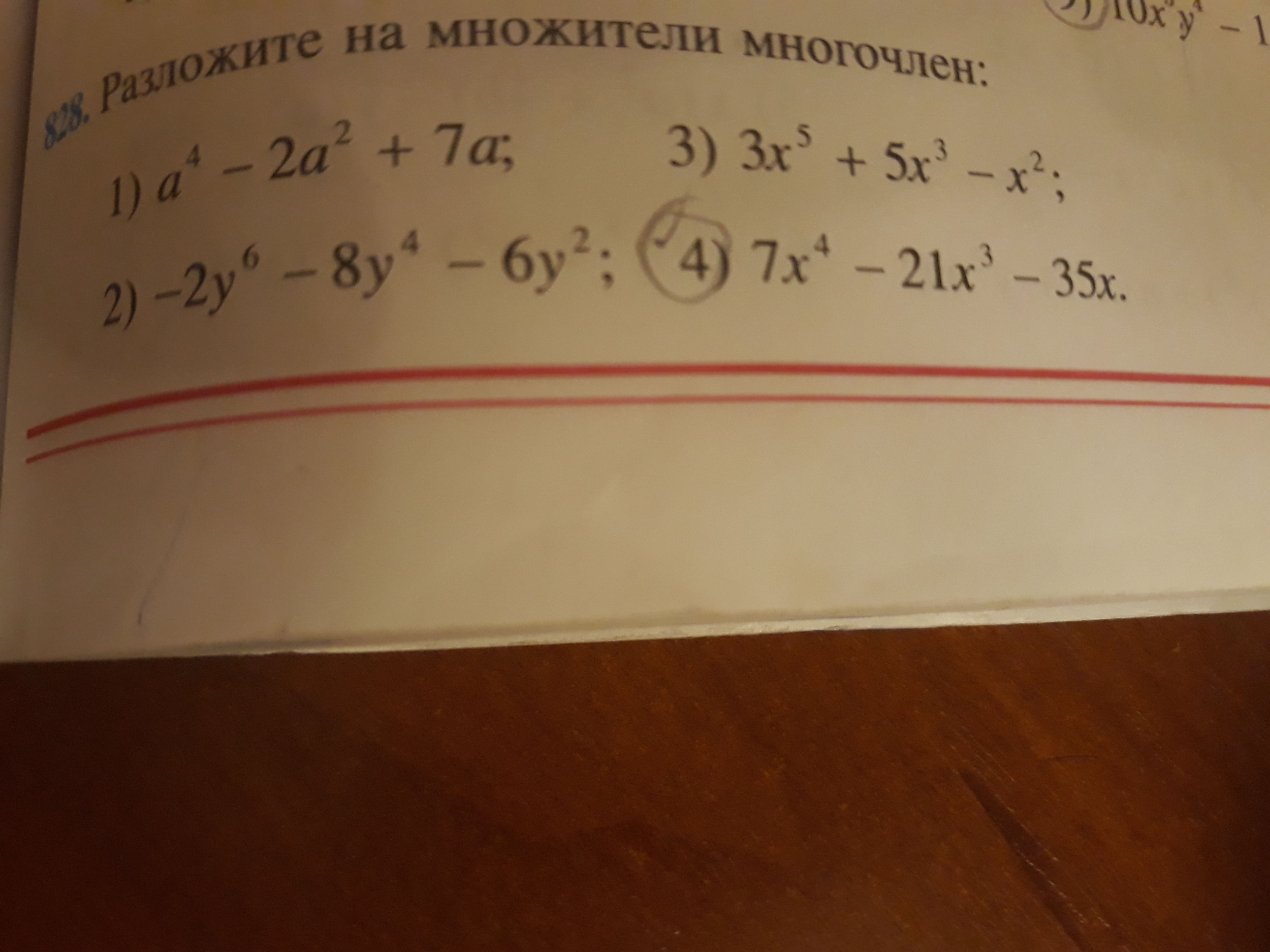 1. а(а"'-2а+7) 2.—2у"(у''''+4у"-3) 3.х"(3х'''+5х-1) 4. 7х(х'''-3х"-5)