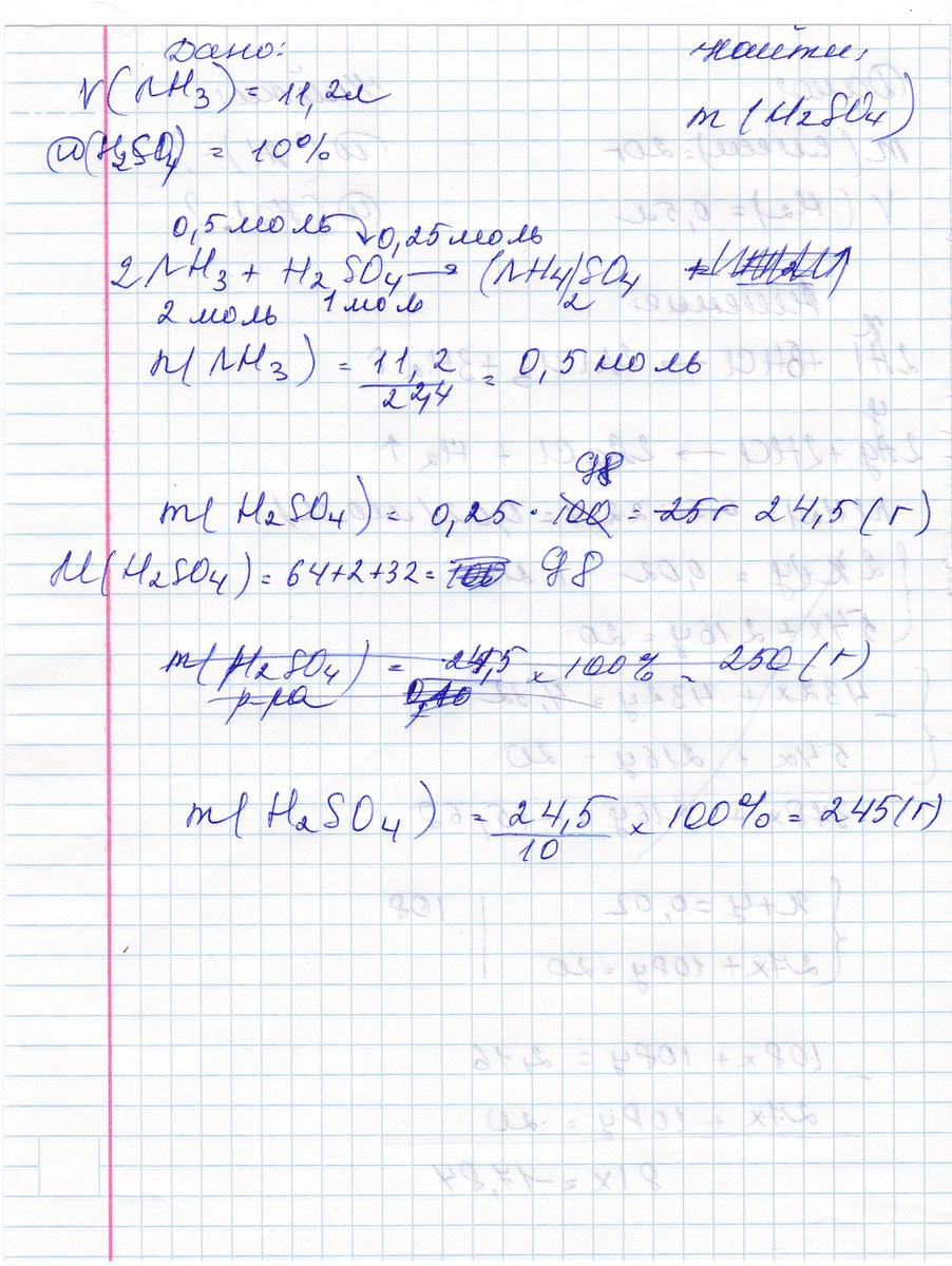 После пропускания 11,2 л (н.у) аммиака через 10 процентный раствор серной кислоты получили раствор средней соли. Определите массу исходного раствора серной кислоты.