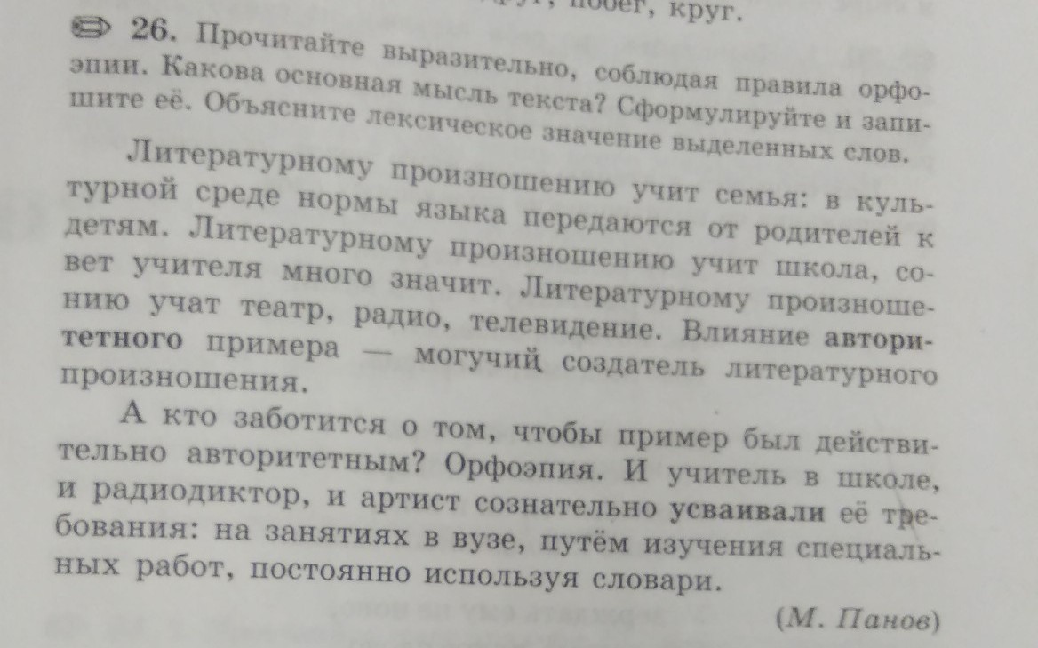 Основная мысль: литературному произношению учит семья, школа и средства массовой информации. Основным созидателем литературного произношения является влияние авторитетного примера, такого как орфоэпия .