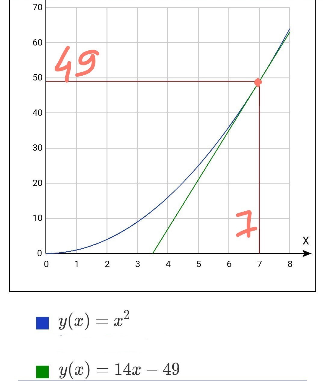 Докажите, что парабола y=x2 и прямая y=14x-49 имеют только одну общую точку
